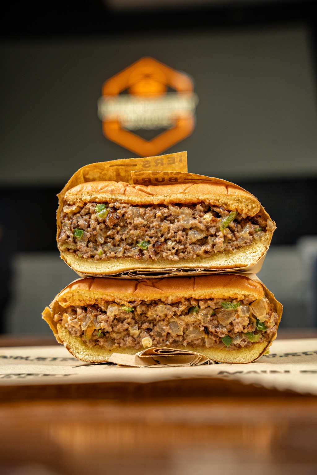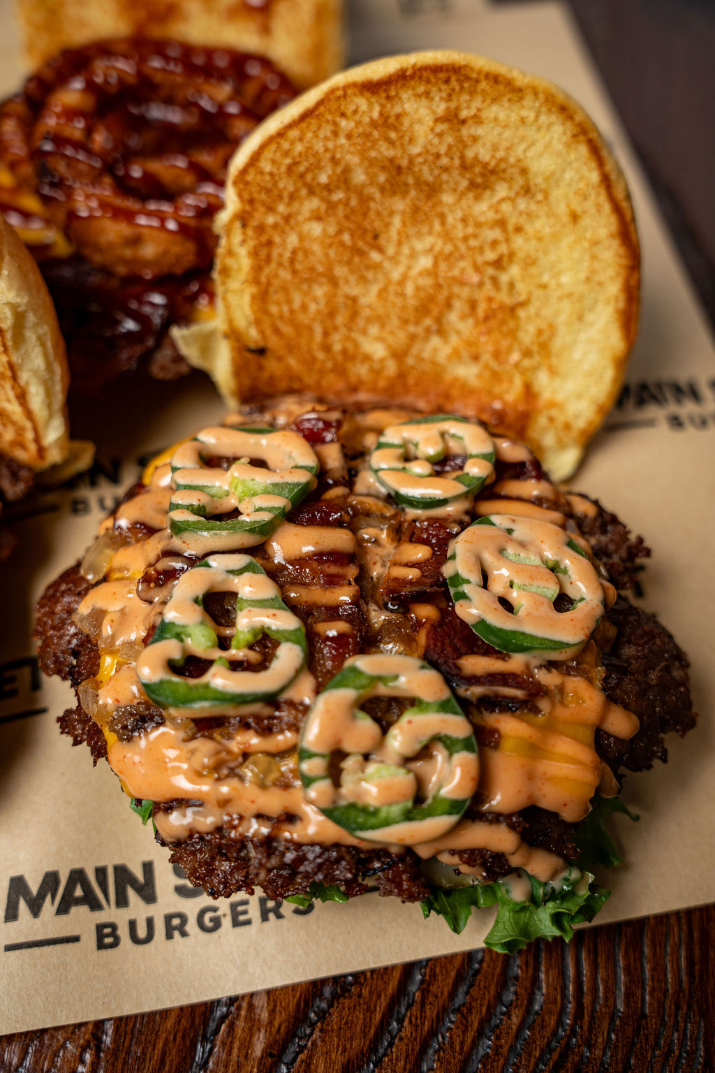 A Double Patty Burger, with American Cheese, Lettuce, Tomato, Pickle, and topped with Grilled Onions, Grilled Jalapeños, Bacon, and Street Sauce.
