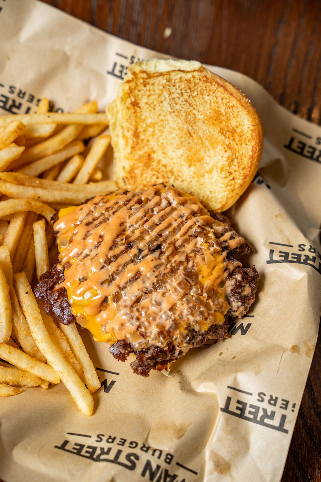 Double Burger with Cheese, Lettuce, Tomato, Pickles and topped with grilled onions and Street Sauce.